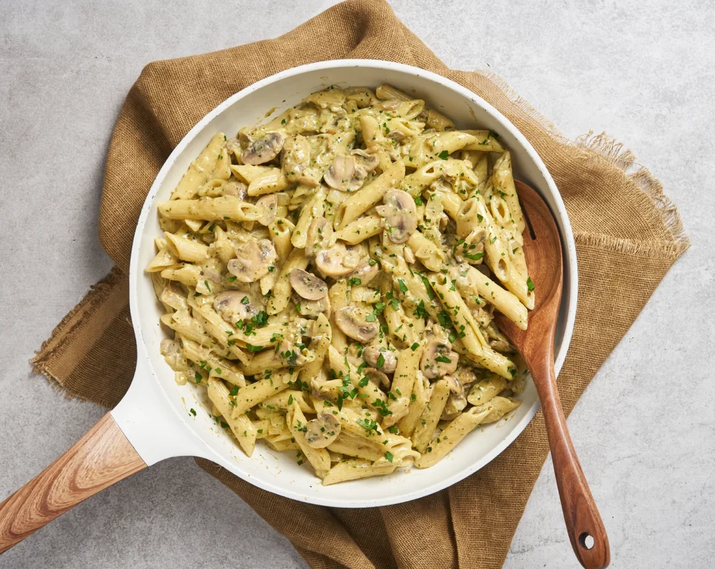 This pasta is made with basil pesto, cream, grilled chicken, and sautéed mushrooms. The sauce has a silky texture that clings perfectly to the penne, giving you full flavor in every forkful. The combination of tender chicken and earthy mushrooms brings an umami depth, while the basil pesto adds that unmistakable nutty aroma.